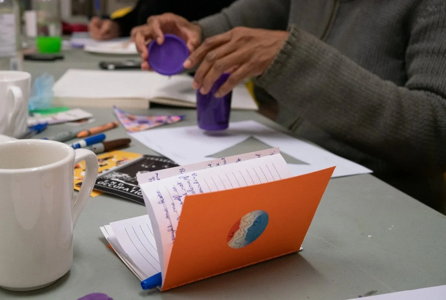 First and foremost, I set up our space with as much warmth as I know how. I bring notebooks and paper that pop with colour, fill the tables with Play-Doh, markers, and colouring pencils, and share Living Hyphen’s beautifully illustrated stickers and bookmarks. I bring my speaker and curate a playlist of recognizable hits to welcome everyone into the room, and calming music for our writing time.